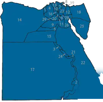 Podział administracyjny Egiptu zdefiniowany jest przez Konstytucję Arabskiej Republiki Egiptu, jak również zasady tworzenia rad lokalnych i zakres ich kompetencji. Zgodnie z nią istnieje 27 muhafaz (gubernatorstw), dzielących się na okręgi, wsie i miasta (18 kwietnia 2008 roku zostały wydzielone dwie muhafazy: Heluan i As-Sadis min Uktubar, lecz zlikwidowano je w kwietniu 2011 roku).