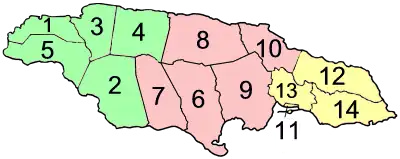 Jamajka jest podzielona na 3 hrabstwa, a te na 14 regionów (gmin).