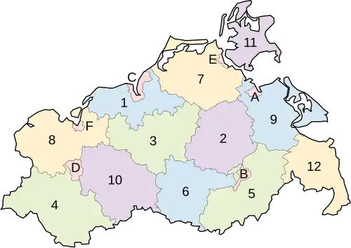 Niemiecki kraj związkowy Meklemburgia-Pomorze Przednie od 4 września 2011 r. na podstawie ustawy Landtagu Meklemburgii-Pomorza Przedniego z 12 lipca 2010 r.[1] jest podzielony na 6 powiatów (niem. Landkreis) i 2 miasta na prawach powiatu (kreisfreie Stadt).