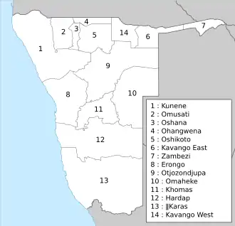 Namibia dzieli się na 14 regionów administracyjnych, które z kolei dzielą się na 121 okręgów wyborczych[1].