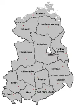 Podział NRD od 1952 r. – 15 okręgów (niem. Bezirke):