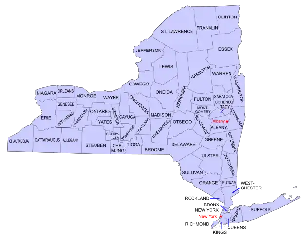 Hrabstwa (county) stanowią jednostki administracyjne pierwszego rzędu w podziale stanu. Mają one swoje władze[2] ulokowane w siedzibach hrabstw[3]. Wyjątkiem jest tu 5 hrabstw tworzących miasto Nowy Jork, które nie mają funkcjonujących władz i określane są jako boroughs. Pierwotnie hrabstwa stanowiły tylko podjednostki władzy stanowej. Współcześnie mają władzę i zdolność podatkową, umożliwiającą świadczenie różnych usług publicznych. Należą tu m.in.: zapewnienie służb porządkowych, bezpieczeństwa publicznego, usług socjalnych i służby zdrowotnej oraz oświaty. Stan Nowy Jork podzielony jest na 62 hrabstwa[2].