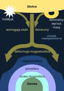 Rozbłyski produkują podwyższoną emisję promieniowania rentgenowskiego, wpływając na jonosferę. Skutkuje to zaburzeniami komunikacji radiowej (szczególnie krótkofalowej) i pogorszeniem jakości odbieranego sygnału. Absorpcja promieniowania kosmicznego prowadzi również do ogrzewania, a tym samym do ekspansji górnych warstw atmosfery. Satelity krążące na niskiej orbicie okołoziemskiej napotykają wtedy zwiększony opór aerodynamiczny, co prowadzi do obniżania orbity i w skrajnych przypadkach grozi ich spadkiem na powierzchnię planety[19]. Podczas burz magnetycznych natężenie prądu pierścieniowego w magnetosferze może wzrosnąć nawet o kilka rzędów wielkości i powierzchnia satelity może zostać silnie naładowana elektrycznie, co prowadzi do powstawania przebić i różnych usterek.