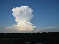 Proces rozpoczyna się zazwyczaj późnym rankiem lub wczesnym popołudniem, gdy partie powietrza o dodatniej wyporności wznoszą się do poziomu kondensacji, tworząc cumulusy. Ostatecznie pojawia się pojedyncza wznosząca się kolumna powietrza o dodatnim wyporze, zwana prądem wstępującym, ponieważ ocieplenie zachodzące w chmurze z powodu kondensacji, zwiększa dodatnią wyporność partii powietrza. Początkowe cumulusy zwykle szybko zanikają, ale nowe często rozwijają się w tej samej kolumnie, co pierwotne cumulusy i „korzystają” z pary wodnej z kropelek chmur, które wyparowały wcześniej. Jeśli istnieje wystarczająca ilość wilgoci o niskim poziomie i utrzymujących się z czasem partii powietrza o dodatniej wyporności, ciąg cumulusów może teraz rosnąć w pojedynczej kolumnie powietrza, tworząc z czasem chmury Cumulus congestus.[2]
