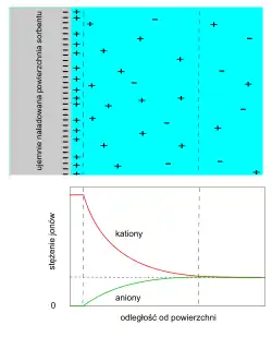 - zachodzącej przy wysokim pH dysocjacji, polegającej na odłączeniu protonu od znajdujących się na powierzchni cząstek koloidalnych grup –OH, –COOH, –NH