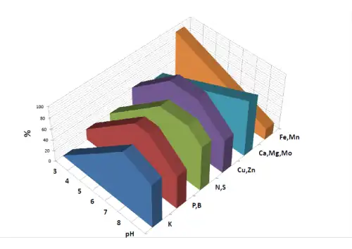 Wpływ pH na dostępność innych kationów dla roślin uprawnych przedstawiono na orientacyjnym wykresie, wraz z informacjami o dostępności innych pierwiastków, zatrzymywanych przez sorbent glebowy w wyniku specyficznej i niespecyficznej adsorpcji anionów (np. absorpcja NO−