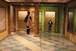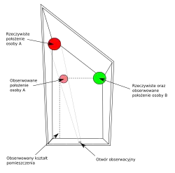 Z zewnątrz pomieszczenie wygląda jak „normalny” prostokątny pokój, ale w rzeczywistości pomieszczenie ma kształt trapezu. Dla zewnętrznego obserwatora osoba stojąca w odległym kącie pokoju (duże czerwone koło) wydaje się być dużo mniejsza od osoby stojącej w bliższym kącie pokoju (zielone koło), choć w rzeczywistości osoby te są tej samej (w przybliżeniu) wielkości.