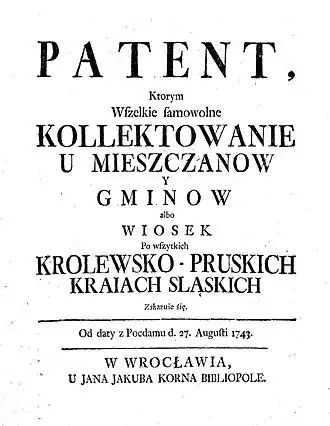 Jeden z pierwszych dekretów Fryderyka Wielkiego po całkowitym przejęciu władzy na Śląsku wystawiony został 8 czerwca 1764 roku we Wrocławiu i był skierowany przeciwko językowi polskiemu. Nakazał on wprowadzenie języka niemieckiego jako języka urzędowego oraz zakazywał zatrudnienia w szkołach nauczycieli nieposługujących się językiem niemieckim. Zabroniono również pod karą grzywny wynoszącą 10 talarów każdemu dominium zatrudnianie kogokolwiek bez znajomości języka niemieckiego do pracy oraz służby w folwarku, a nawet zakazywano urzędnikom udzielania zgody na śluby, jeżeli nowożeńcy nie nauczą się mówić po niemiecku[31][32]. Wprowadzono restrykcje w używaniu języka polskiego we wszystkich szkołach i urzędach. Radcom ziemiańskim powiatów wrocławskiego, brzeskiego, niemodlińskiego, oławskiego, grodkowskiego, nyskiego, średzkiego, trzebnickiego, oleśnickiego, namysłowskiego, kluczborskiego i sycowskiego Fryderyk oznajmiał: