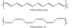 Poliacetylen zbudowany jest z długich łańcuchów, w których wiązania pomiędzy atomami węgla są formalnie na przemian podwójne i pojedyncze (tzw. wiązania sprzężone). W rzeczywistości wiązania sprzężone są uśrednione, a elektrony tworzące wiązania π ulegają delokalizacji[2] wzdłuż całej cząsteczki polimeru, co umożliwia im łatwe przemieszczanie się i przewodzenie prądu elektrycznego.