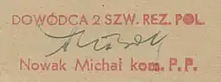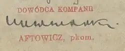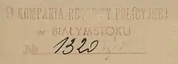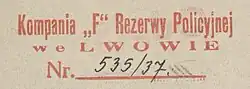 - ↑ Dowódcą kompanii był podkom. PP Robert Wawrzyniec Aftowicz (1902–1940). 9 grudnia 1938 służbę w kompanii pełnili: przodownik Albin Hawryłkiewicz (p.o. dowódcy plutonu), st. post. Franciszek Cieplik (p.o. dowódcy plutonu), st. post. Zygmunt Sieradzki (p.o. dowódcy plutonu, ppor. piech. rez. ze starszeństwem z 1 stycznia 1935, przydzielony w rezerwie do 19 pp), post. Stefan Duda (drużynowy) i Stanisław Borowski (drużynowy)[43]. Wymienieni wyżej szeregowi (Cieplik, Sieradzki, Duda, Borowski) zostali przeniesieni do 10 Kompanii Rezerwy Policyjnej w sierpniu 1938[44]. Komendant Wojewódzki Policji we Lwowie zarządził delegację do Lwowa, pozostającej w jego dyspozycji 10 Kompanii Rezerwy Policyjnej w Jarosławiu. Kompania przybyła do Lwowa 24 stycznia 1939 o godz. 17.00 w składzie 1 oficera, 17 szeregowców i 84 kandydatów kontraktowych[34].