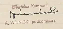 - ↑ 22 kwietnia 1936 na stanowisko dowódcy Kompanii „D” Rezerwy Policyjnej w województwie kieleckim wyznaczony został komisarz Józef Mieczysław Munk, dotychczasowy komendant powiatowy w Radomiu[32]. 2 czerwca 1936 komisarz Munk został przeniesiony na stanowisko komendanta powiatowego PP w powiecie kowelskim[33], a wiosną 1940 zamordowany w Kalininie. Nowym dowódcą Kompanii „D” został podkom. Adam Winnicki, dotychczasowy kierownik Komisariatu I w m. Lwowie[33]. 4 Kompania Rezerwy Policyjnej w Herbach Starych w składzie 1 oficera, 16 szeregowców i 72 kandydatów kontraktowych z polecenia ministra spraw wewnętrznych została delegowana do Złoczowa w miejsce 2 Kompanii Grupy Rezerwy Policyjnej. Kompania wyjechała z Herb Starych 25 stycznia 1939 o godz. 6.30. Do Złoczowa przybyła 26 stycznia o godz. 16.00[34].