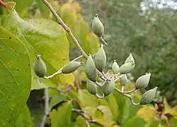 - Zrzucane przed zimą[5], skrętoległe, bez przylistków[7]. Ogonek liściowy długi – osiągający do 6 cm długości[6], z parą gruczołków[6]. Blaszka liściowa pojedyncza, jajowata do sercowatej, osiągająca od 8 do 18 cm długości, od spodu owłosiona[5][6], na brzegu piłkowana, na wierzchołku zaostrzona[7].