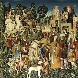 Siedem tapiserii obrazuje polowanie na jednorożca. Temat polowania był wielokrotnie preferowany w średniowieczu, zwłaszcza w dobie rozwoju kultury dworskiej, w której polowanie na dzikie zwierzęta (zwłaszcza jelenie) stanowiło ważną potrzebę, a także obyczaj i rozrywkę. Ten dworski temat w sztuce średniowiecznej nie ograniczył się bynajmniej do zilustrowania dworskiego rytuału, lecz zawiera głębokie treści, a poszczególni ludzie, zwierzęta i rośliny zawierają wyszukaną symbolikę mającą silny związek z Jezusem, Marią i świętymi.