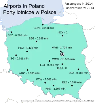- ↑ Liczba obsłużonych pasażerów oraz wykonanych operacji w ruchu krajowym i międzynarodowym – regularnym i czarterowym w latach 2019–2021. [w:] Urząd Lotnictwa Cywilnego [on-line]. marzec 2022. [dostęp 2022-07-05].