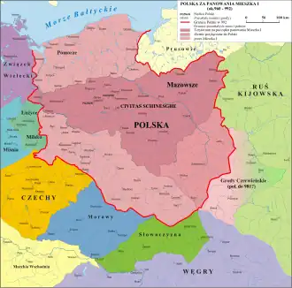 Polska uformowała się w jednolicie zarządzane terytorium w połowie X wieku. Pierwszym potwierdzonym historycznie władcą Polski był Mieszko I z dynastii Piastów, który w 966 roku przyjął chrzest poprzez Kościół rzymski, co zapoczątkowało koniec słowiańskich wierzeń pogańskich i chrystianizację społeczeństwa. Przyjęcie chrztu miało w owym czasie także duże znaczenie polityczne. Incipit zatytułowany Dagome iudex jako pierwszy określił granice geograficzne Polski, oraz potwierdził, że jej monarchia znajduje się pod opieką Stolicy Apostolskiej. Pierwszym władcą, który został koronowany na króla Polski w 1025 był syn Mieszka I – Bolesław I Chrobry. Kontynuując politykę ojca, Bolesław I rozszerzył granice państwa Polskiego, zajmując części niemieckich Łużyc, czeskich Moraw, górnych Węgier (dziś Słowacja) i południowo-zachodnich regionów Rusi. Także w 1000 roku zorganizował on zjazd w Gnieźnie, na którym utworzono metropolię gnieźnieńską oraz diecezje w Kołobrzegu, Krakowie i Wrocławiu[42].