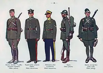 - ↑ (Od lewej) starszy strzelec 9 Pułku Strzelców Konnych w mundurze polowym, kapral pułku artylerii lekkiej w mund. wieczorowym, plutonowy pilot samolotowy w mundurze wieczorowym, saper w ubiorze polowym, starszy szeregowy pułku radiologicznego w ubiorze polowym.