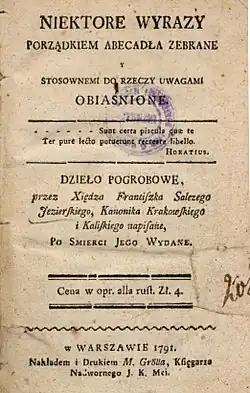 Do osiemnastowiecznych encyklopedii polskich zaliczana jest również książka autorstwa Franciszka Jezierskiego Niektóre wyrazy porządkiem abecadła zebrane, wydana w 1791 roku. Treść haseł została przez autora zabarwiona subiektywnymi komentarzami i pouczeniami.