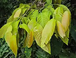 - Mają kształt od podłużnie owalnego do podłużnie lancetowatego lub eliptycznego. Mierzą 10–24 cm długości oraz 5–12,5 cm szerokości. Ogonek liściowy jest nagi i dorasta do 10–18 mm długości[5].