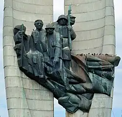 Pomnik stoi na cokole, który od strony placu defilad pełnił w oryginalnym założeniu funkcję trybuny honorowej. Właściwą bryłę pomnika tworzy para bliźniaczych elementów o kształcie stylizowanych liści lauru (symboli zwycięstwa), połączonych na wysokości ok. 8 m przez dwie rzeźby figuralne.