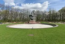 Układ trawników i alejek wokół pomnika zaprojektował Longin Majdecki[24]. Geometryczne rabaty obsadzone są krzewami róż. Wokół monumentu rosną w większości dęby czerwone, a także klony oraz krzewy śnieguliczki białej[24]. Całe założenie ogrodowe z posadzonymi amfiteatralnie drzewami miało przypominać salę koncertową[24].