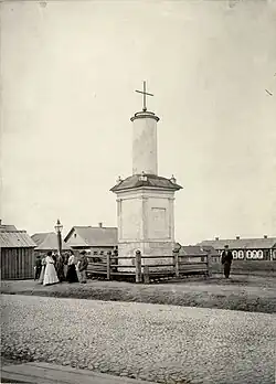 Biała budowla utrzymana była w stylu klasycyzmu i miała formę kolumny na kwadratowym postumencie zwieńczonej krzyżem. Znajdowała się na placu, który otrzymał od niej (używaną do dziś) nazwę placu Jubileuszowego, w przybliżeniu w tym miejscu, gdzie obecnie znajduje się sklep „Technika u bycie”[3].