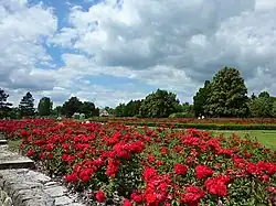 19 czerwca 1955 roku na dawnym obszarze Lidic otwarto Różany Sad Przyjaźni i Pokoju (cz. Růžový sad přátelství a míru)[8][13]. Ogród ten powstał z inicjatywy autora zapoczątkowanej we wrześniu 1942 roku kampanii na rzecz sfinansowania odbudowy Lidic Lidice Shall Live (pol. „Lidice będą żyć”) brytyjskiego posła Barnetta Strossa, dzięki darowiźnie 29 tysięcy krzewów różanych pochodzących z 32 krajów na świecie[14][15][10][8]. Ma on 3,5 ha powierzchni i leży na wysokości 340 m n.p.m., między pierwotną lokalizacją Lidic, a odbudowaną wsią[16]. Jest symbolem przejścia Lidic od tragicznej przeszłości do bardziej przyjaznej teraźniejszości[13]. Został zaprojektowany przez Františka Marka, który przy realizacji projektu współpracował z ekspertami-doradcami Bohumila Kavki i z zespołem innych specjalistów. Marek zorganizował grupy roślin głównie pośrodku ogrodu, tak aby najbardziej imponujące skupione były w centrum i na południowym zboczu[16]. Róże posadzono według określonego wzorca, biorąc pod uwagę ich kolory, kształt, wzrost, czas kwitnienia, kontrasty z tłem itp. Przeważnie sadzone były w grupach na podniesionych grządkach o różnych kształtach i rozmiarach[16]. Niektóre zostały umieszczone jako solitery lub w mniejszych grupach na dywanie z zielonej trawy. W 2015 roku Sad Różany otrzymał dwie główne nagrody[16]. W ramach 25. edycji corocznego festiwalu Pelhřimov – Miasto Rekordów otrzymał tytuł „Rekord Roku” za największą liczbę krzewów różanych w jednym ogrodzie. Światowa Federacja Towarzystw Różanych (ang. World Federation of Rose Societies) przyznała mu z kolei nagrodę Award of Garden Excellence, co uczyniło go jednym z najważniejszych ogrodów różanych na świecie[16]. Obecnie w ogrodzie znajduje 24 tysiące krzewów z 240 gatunków i odmian róż, które są regularnie uzupełniane i odnawiane[16].
