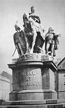 Pomnik przedstawiał Marię Teresą konno, w węgierskim stroju narodowym i z koroną świętego Stefana na głowie. Towarzyszyło jej dwóch huzarów, symbolizujących oddaną węgierską szlachtę. Na cokole umieszczono łacińską dewizę vitam et sanguinem (życie i krew), która była skróconą wersją okrzyku wzniesionego przez poddanych, gdy królowa poprosiła ich o wsparcie w wojnie o sukcesję austriacką (vitam et sanguinem pro rege nostro). Autorem pomnika był urodzony w Pozsony węgierski rzeźbiarz János Fadrusz. Miejsce wybrano nieprzypadkowo – w przeszłości znajdował się tu niewielki kopiec (Königsberg), na którym odbywała się część ceremonii koronacyjnych.