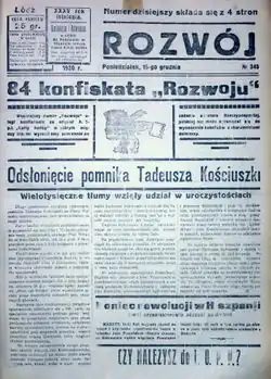 - ↑ Łódź w hołdzie bohaterowi spod Racławic. Odsłonięcie pomnika Tadeusza Kościuszki. Tysięczne rzesze wzięły udział w uroczystości; [w:] „Hasło Łódzkie”, nr 342, 15 XII 1930, s. 2.