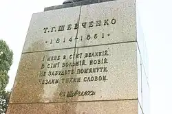 Na cokole znajduje się napis w języku ukraińskim: „T.G. Szewczenko 1814–1861”, a inskrypcję pod nim stanowią słowa poety z „Testamentu”: