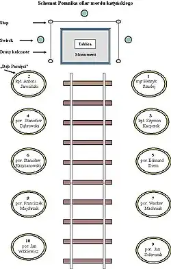- podkłady kolejowe – liczba podkładów kolejowych (10 szt.) nawiązuje do ilości upamiętnionych „Dębami Pamięci” pomordowanych oficerów,