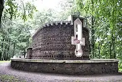 Pomnik ma formę niezadaszonej budowli, której ściany oglądane z góry tworzą kształt litery "U". Półkoliste zamknięcie budowli posiada otwór (okno) w kształcie wzniesionego do góry miecza. Ściany budowli wykonane są z ułożonych w sposób dekoracyjny nieotynkowanych cegieł. Zwieńczenie ścian zdobi pseudokrenelaż. Podczas remontu w 1993 na ścianach pomnika umieszczono dwie tablice (jedną w języku polskim, drugą w języku niemieckim) o następującej treści: