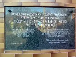 - Trójjęzyczna tablica pamiątkowa garnizonu Prudnik przy bramie wjazdowej do dawnych koszar przy skrzyżowaniu ulic: Legionów i Dąbrowskiego powstała z inicjatywy Stowarzyszenia Integracji Rodzin Wojskowych Kadry Zawodowej byłego Garnizonu w Prudniku i Koła Miejsko-Gminnego Związku Byłych Żołnierzy Zawodowych i Oficerów Rezerwy Wojska Polskiego w Prudniku. Upamiętnia żołnierzy i pracowników cywilnych różnych narodowości, którzy w latach 1904–1994 służyli bądź pracowali w koszarach Prudniku. Napis na tablicy został wybrany w ankiecie przeprowadzonej w 2006 wśród mieszkańców Prudnika i powiatu prudnickiego na łamach „Tygodnika Prudnickiego” oraz m.in. w firmie „Artech” na terenie koszar. Wybrany napis głosi w językach polskim, niemieckim i czeskim: „Żołnierzom wszystkich formacji wojskowych, byłym pracownikom cywilnym, którzy w tych murach w latach 1904–1994 spędzili swoją młodość”[73]. Tablica została odsłonięta 19 maja 2007[74].