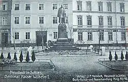 - Pomnik cesarza Wilhelma I na Victoriaplatz (obecnie plac Szarych Szeregów) został wzniesiony w 1905 przez Theodora von Gosen. Mierzył trzy metry, był wykonany z brązu i stał na granitowym postumencie[76]. W celu jego wzniesienia uformowany został komitet. Część środków na budowę przeznaczył Emanuel Fränkel[77], który wraz z bratem Albertem i Josefem Pinkusem sfinansował ogrodzenie pomnika[52]. Pomnik został odsłonięty 14 października 1905[77]. Cesarz w prawej dłoni trzymał lornetkę, jego prawa noga byłą wysunięta do przodu, zaś lewa ręka spoczywała na mieczu. Miał na sobie płaszcz i hełm. Cokół pomnika zdobiła cesarska korona, liście laurowe oraz niemiecki napis „Cesarz Wilhelm Wielki”[78]. Pomnik zaginął w nieznanych okolicznościach po zajęciu miasta przez Armię Czerwoną w 1945. Kamienna podstawa stała na placu do lat 60. XX wieku. Na jego miejscu ustawiono głaz poświęcony „dzieciom i młodzieży polskiej, bohaterom i ofiarom wojny”[52].