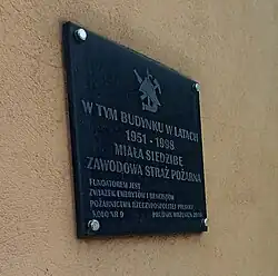 - Tablica na ścianie budynku przy ul. Wiejskiej 1, zamontowana 1 października 2010 upamiętniała znajdującą się w tym miejscu w latach 1951–1998 siedzibę zawodowej straży pożarnej. Została ufundowana przez koło nr 9 Związku Emerytów i Rencistów Pożarnictwa RP w Prudniku[88]. 13 marca 2023 budynek został wyburzony, a w jego miejscu wzniesiono supermarket[89].
