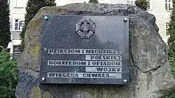 - Głaz z tablicą upamiętniającą dzieci i młodzież polską – ofiary wojny został postawiony na placu Szarych Szeregów, w miejscu, w którym do 1945 znajdował się pomnik cesarza Wilhelma I[52]. Napis na tablicy głosi: „Dzieciom i młodzieży polskiej bohaterom i ofiarom wojny wieczna chwała…”[53]. Przed obeliksem odbywają się uroczystości prowadzone przez Komendę Hufca ZHP w Prudniku[54].