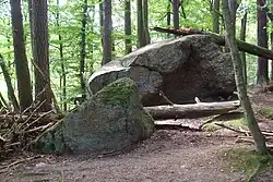 | 6. | Oliwa | ul. Bytowska, Leśnictwo Renuszewo oddz. 112d, na zboczu przy łące w Dolinie Radości | głaz narzutowy | „Diabelski Kamień” grubokrystaliczny granit, mocno zwietrzały, rozłupany na dwie części | 1230 i 270 | d4,3/sz3,9 | 1962 | 133 | |