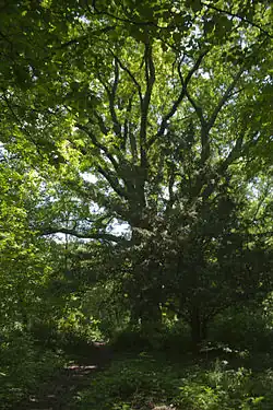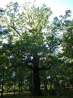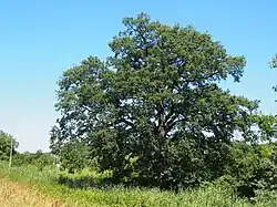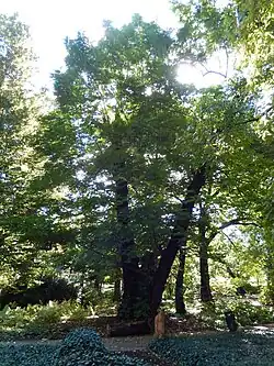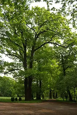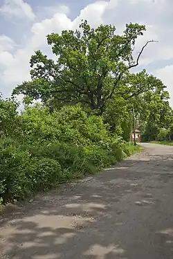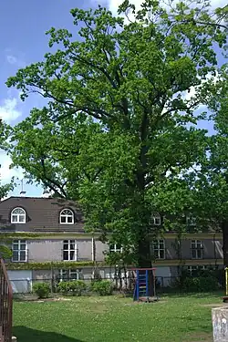 | 7 | Dąb szypułkowy Dziadek Quercus robur o obwodzie 629 cm | Przed budynkiem Ośrodka Szkoleniowego Państwowej Inspekcji Pracy, w odległości 10 m od chodnika drogi dojazdowej 1 m. | 1 | Decyzja 2/53 z dnia 16 lutego 1953 r. | ![]() |