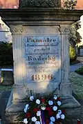 Po południowo-wschodniej i południowo-zachodniej stronie pomnika znajdują się płaskorzeźby przedstawiające lwy leżące na skale, a po obu stronach cokołu marmurowe płyty z inskrypcjami. Na stronie północno-zachodniej z napisem: cz. Vaše heslo bylo stále: Pro vlast a krále[2], po stronie północno-wschodniej z napisem: cz. Blahoslavení mrtví, kteří v povinnosti zemřeli, oni odpočívají zbaveni svízelů svých, skutkové jejich však je doprovázejí[3], od strony południowo-wschodniej z napisem: cz. Památce v Pánu zemřelých členů postavil spolek vojenských vysloužilců "Radecký" v Polici nad Metují nákladem svým a dobrodinců léta Páně 1896[4]; po stronie południowo-zachodniej z napisem: cz. Všelika věc vezdejší jest marná a pomíjí. Bůh ale a ti kdo chodí v přikázáních jeho, zůstanou na věky[5]. Po północnej stronie cokołu jest sygnatura F. Holzela i Szwejdara[1][6].