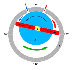 Zasadę działania pompy łopatkowej pokazuje rysunek. Łopatki (3) osadzone są w wirniku (2), który jest umiejscowiony mimośrodowo wewnątrz korpusu (1) pompy. Łopatki są rozpierane w kierunku korpusu za pomocą sprężyn (4). W czasie obrotu wirnika, łopatki zagarniają ciecz z komory ssawnej do przestrzeni międzyłopatkowej przenosząc ją do komory tłocznej pompy.