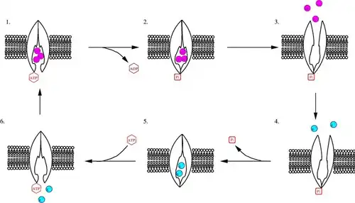Siłą napędową tego enzymu, potrzebną do pompowania jonów sodu i potasu, jest hydroliza ATP. ATP-aza Na+/K+ jest fosforylowana przez ATP w obecności jonów sodu i magnezu. Do podjednostki α, która jest związana z ATP, wiązane są trzy jony sodu. Następnie ATP ulega hydrolizie, a zmiana konformacji białka pozwala na przetransportowanie jonów sodu na zewnątrz komórki, gdzie zostają uwolnione z kompleksu. Zachodzi tu związanie dwóch jonów potasu oraz defosforylacja, wywołująca ponowną zmianę konformacji pozwalającą na przeniesienie jonów potasu do wnętrza komórki. Tu uwolnienie jonów następuje po przyłączeniu cząsteczki ATP.