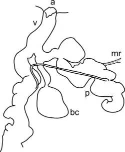 Układ rozrodczy. a: atrium, v: pochwa, p: prącie, mr: wciągacz prącia, bc: torebka kopulacyjna