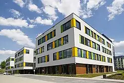 Budynek został zrealizowany na planie litery E. Pomieszczenia są wykończone jasnymi kolorami, natomiast ściany ozdobione zostały grafikami przygotowanymi przez artystów z wrocławskiej Akademii Sztuk Pięknych[6].