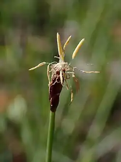 - Zebrane w 2-7-kwiatowy kłos o długości 4-8 mm. Dolna podsadka sięga powyżej połowy długości kłosa. Okwiat złożony z sześciu szorstkich szczecinek, nie dłuższych od owocu. Trzy pręciki. Trzy znamiona. Przysadki tępe, brunatnoczerwoanawe, z zieloną smugą. Najniższa przysadka prawie tak długa jak kłos, obejmuje cały kłos swą nasadą. Szyjka słupka nie zgrubiała u nasady, tworząca mały i cienki dzióbek, który nie jest oddzielony od owocu członowatym wcięciem.