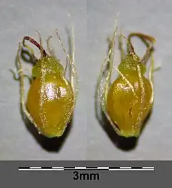 - Zebrane w wielokwiatowy, wydłużony kłos o długości 5-20 mm. Okwiat złożony z 5-8 szczecinek, dłuższych od owocu. Dolna podsadka nie sięga połowy długości kłosa. Przysadki ostre, o długości 2-3 mm, wyrastają w 8-11 ukośnych rzędach, odpadają w czasie owocowania. Najniższa przysadka obejmuje swą nasadą pół szerokości kłosa. Szyjka słupka mocno rozszerzona u nasady, tworząca czapkowaty dzióbek, członowato oddzielony od owocu. Dwa znamiona.