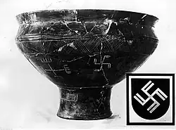 Niemiecki historyk Walter Kersten[5] opublikował naczynie w 1944 r. w czasopiśmie Posener Jahrbuch für Vorgeschichte (Poznański Rocznik Prehistorii) z powodu znajdujących się na nim swastyk, gdzie omówił znajdujące się na niej piktogramy. Na brzuścu (największej części naczynia) znajduje się sześć rysunków, które Kersten wymienia od lewej strony do prawej[2]: