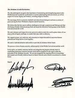 11 września Bahrajn ogłosił wolę nawiązania stosunków z Izraelem, a 15 września 2020 roku w stolicy Stanów Zjednoczonych, Waszyngtonie, Izrael i ZEA podpisały Traktat o pokoju, relacjach dyplomatycznych i pełnej normalizacji między, Izrael i Bahrajn Deklarację o pokoju a Izrael, ZEA, Bahrajn oraz Stany Zjednoczone (te ostatnie w roli świadka) podpisały Porozumienia Abrahamowe[11].