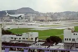 Lotnisko Kai Tak znajduje się na zachodniej stronie Kowloon Bay w Koulun (Hongkong). Okolica otoczona jest skalistymi górami. Mniej niż 10 km na północ i północnym wschód jest pasmo górskie osiągające wysokość 610 m. Na wschód od pasa startowego w odległości mniejszej niż 5 km są wzgórza. Bezpośrednio na południe znajduje się przystań Victoria Harbour i dalej na południe jest wyspa Hongkong ze wzgórzami do 640 m.