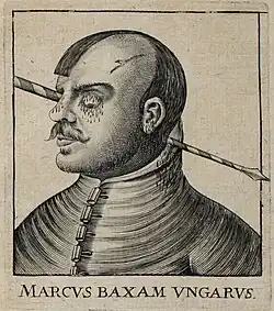 Oprócz obrazu istnieje również miedzioryt, który jest niemal identyczny z obrazem z Galerii Ambras. Przyjmuje się, że powstał najprawdopodobniej w 1598 r. W przeciwieństwie do obrazu, mężczyzna z miedziorytu ma stębnowany kołnierz z prostokątnymi guzikami, jednakże zarówno rana od lancy, jak również przedstawiona osoba są niemal identyczne z tym, co można zobaczyć na portrecie Baciego z zamku Ambras.