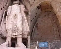 ![]() Większy (55m) z posągów Buddy w Bamianie przed i po zniszczeniu | |