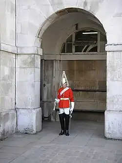 Wartownik królewski w Londynie w postawie zasadniczej z szablą